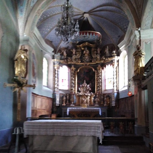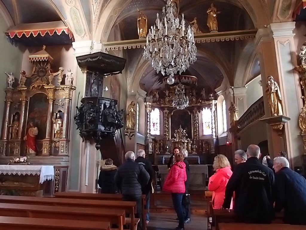 Nous arrivons à Queige, où Monsieur le Maire Edouard Meunier nous fait une visite guidée de l'église Sainte Agathe et nous parle de sa commune et des projets de rénovation de l'église. Le clochard est aussi présent, mais ne vous méprenez pas : le clochard, c'est celui qui est en charge des cloches de l'église...