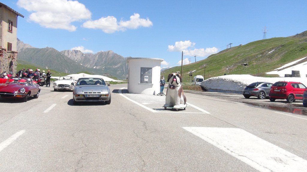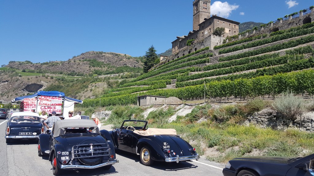 Giù dal passo San Carlo raggiungiamo la strada del Petit-Saint-Bernard, colle che deve essere poi nuovamente risalito ((2.188 m).) Non è necessario fermarsi in cima con un radiatore bollente, tuttavia bisogna raffreddarlo almeno un po’. Aimé e Suzelle stanno facendo gli ultimi della fila e il loro “spider Alfa Romeo” soffre ...