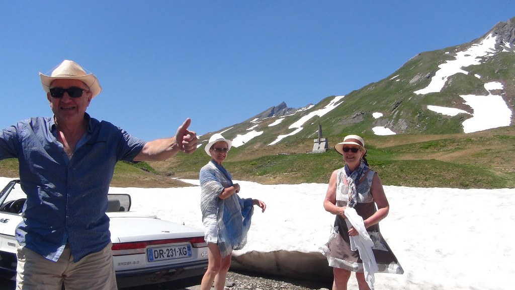 Le passage du Cormet de Roselend (1.968 m) est magnifique, avec la vue sur le lac de barrage, mais on commence à fatiguer ! Il est fatal à notre ami Coco : Sa voiture chauffe, après contrôle il s’avert que le ventilateur ne fonctionne plus. Après avoir remis 7 litres d’eau dans le réservoir, il repart pour la descente jusqu’au restaurant.