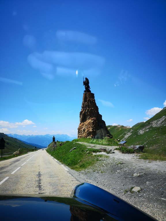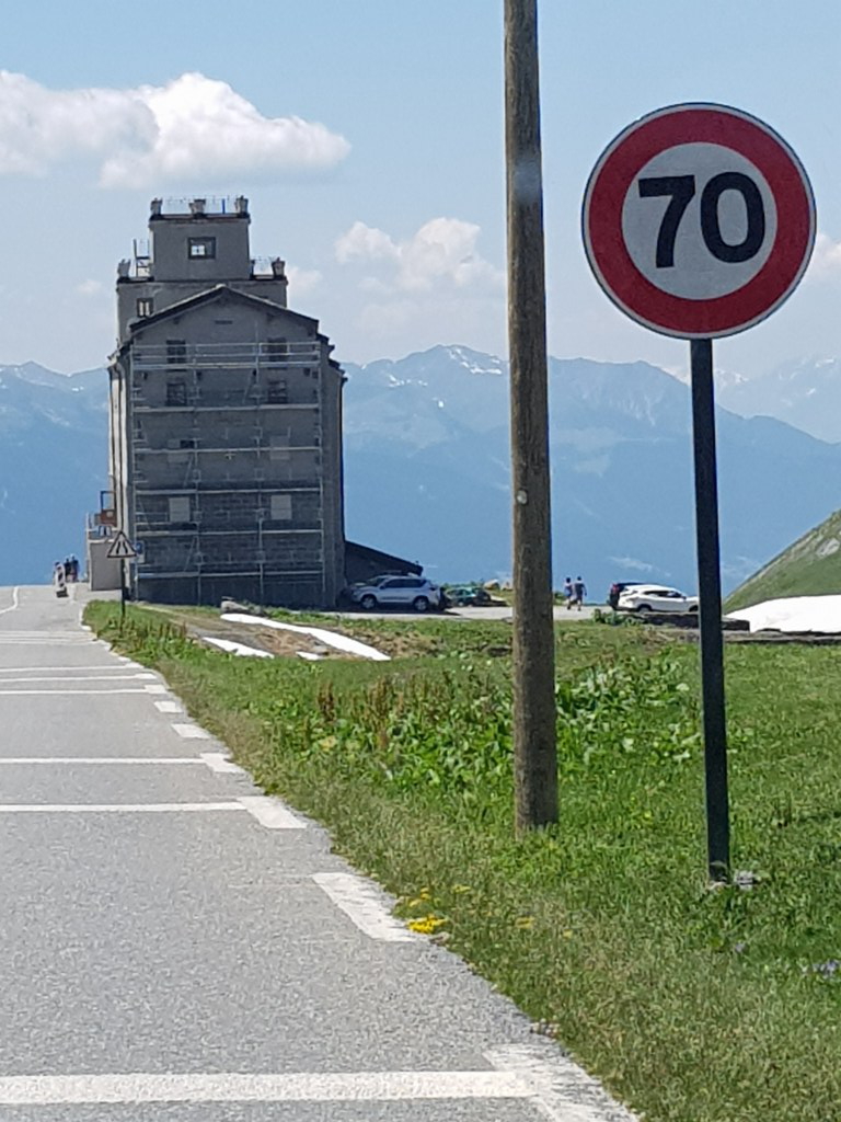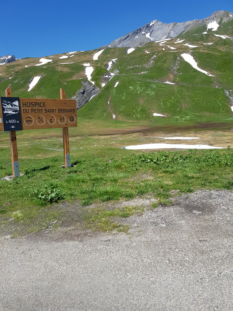 En bas du col San Carlo, on rejoint la route du Petit Saint-Bernard, qu'il faut escalader encore ((2.188 m d'altitude). Pas question de s'arrêter en haut avec un radiateur qui bout, il faut refroidir un peu. Aimé et Suzelle font les serre-file et leur spider Alfa Romeo en souffre...