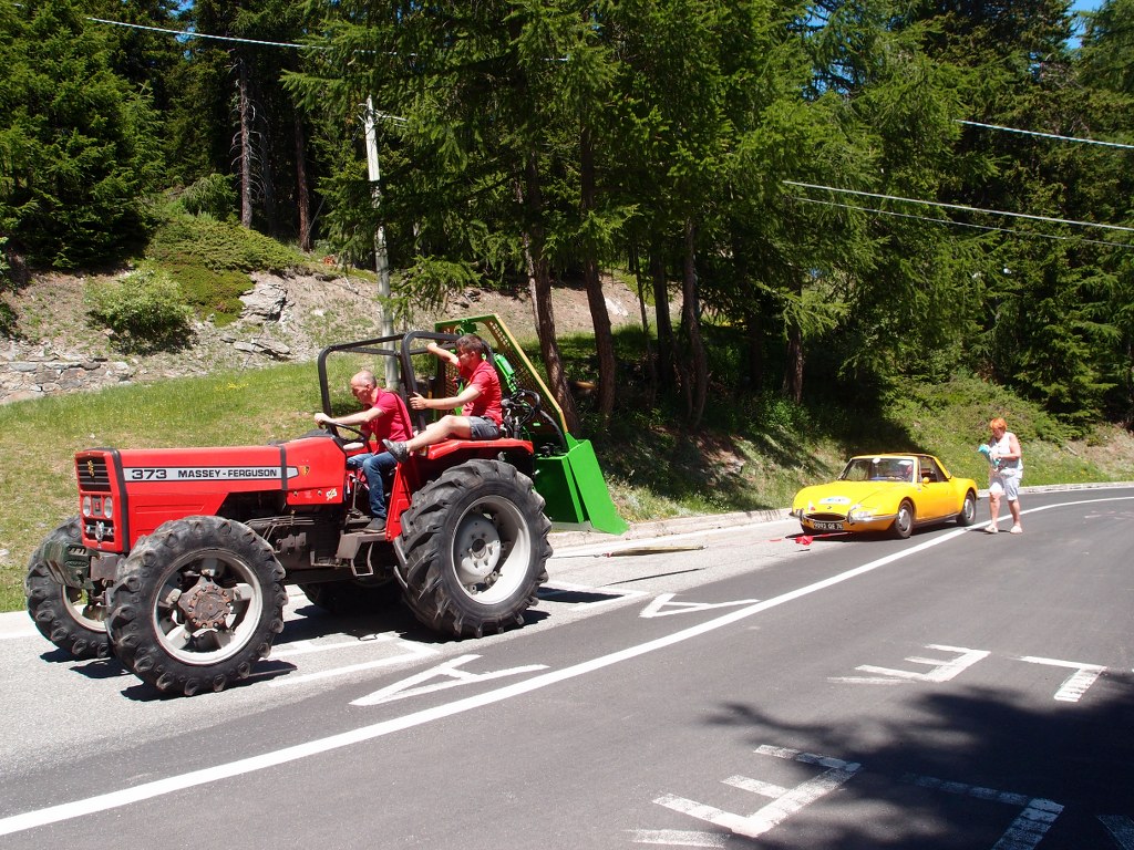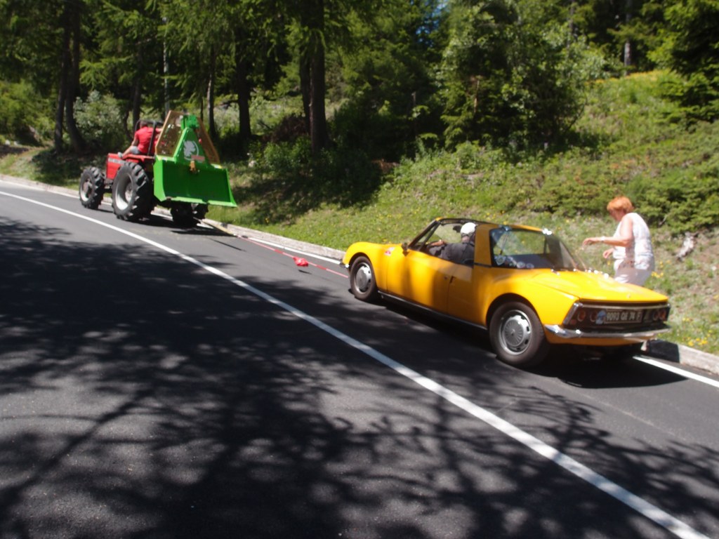 Après Aoste, nous obliquons vers Courmayeur, puis attaquons le col San Carlo. Il est bien raide et certaines autos chauffent : l'Ariane et l'Opel doivent s'arrêter durant 20 minutes à 2,5 km du sommet pour laisser refroidir. Mais le pire s'abat sur la Matra des Riton, qui perd tout son liquide à seulement 1 km du sommet (1.950 m). Ils devront être remorqués... par un tracteur agricole !