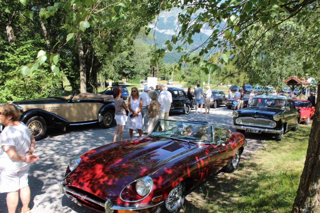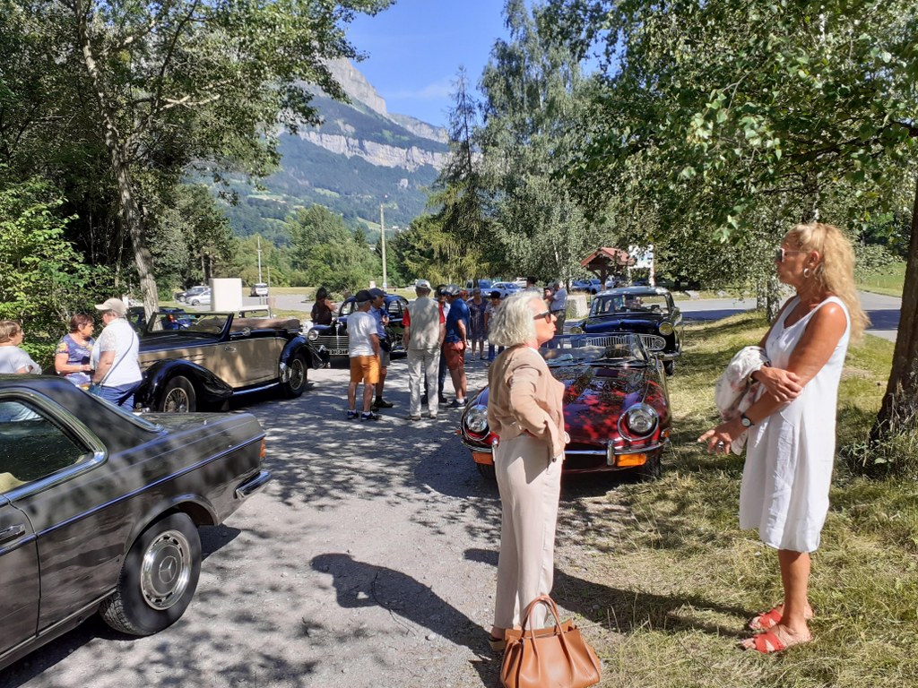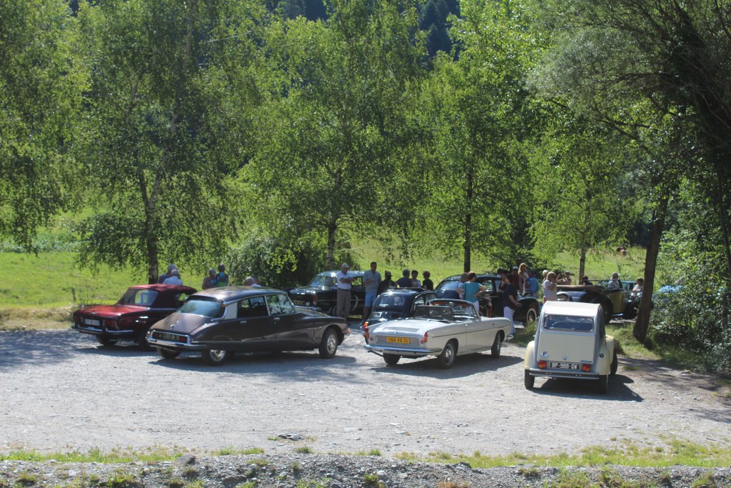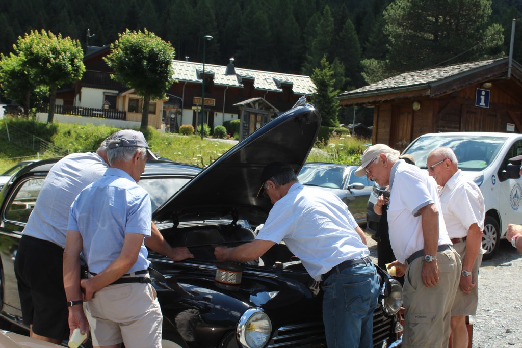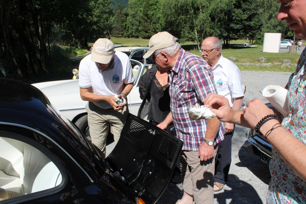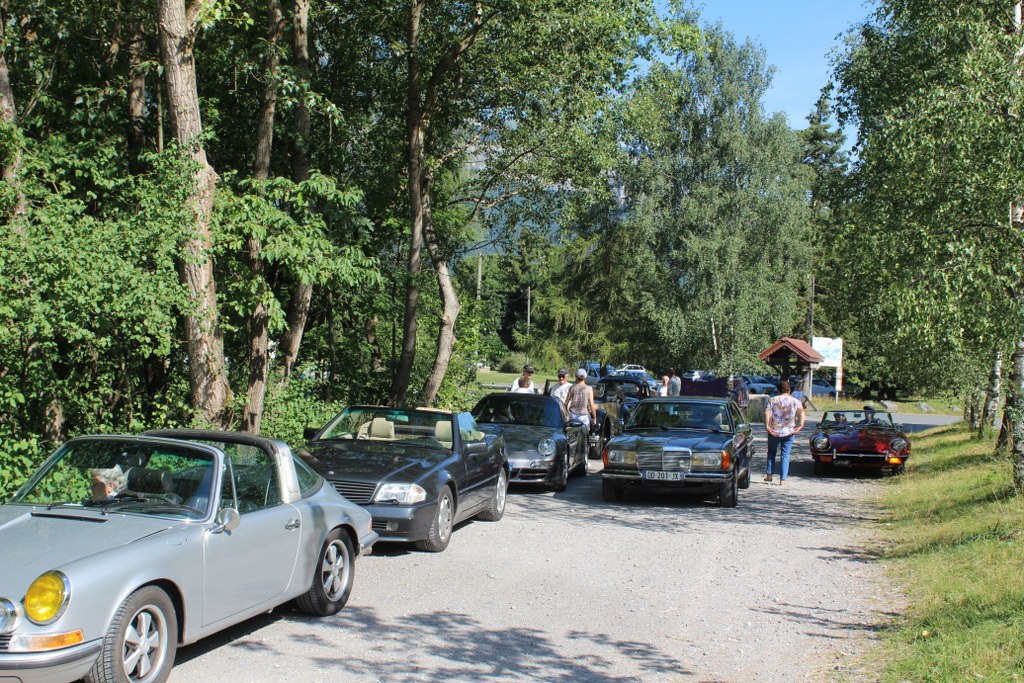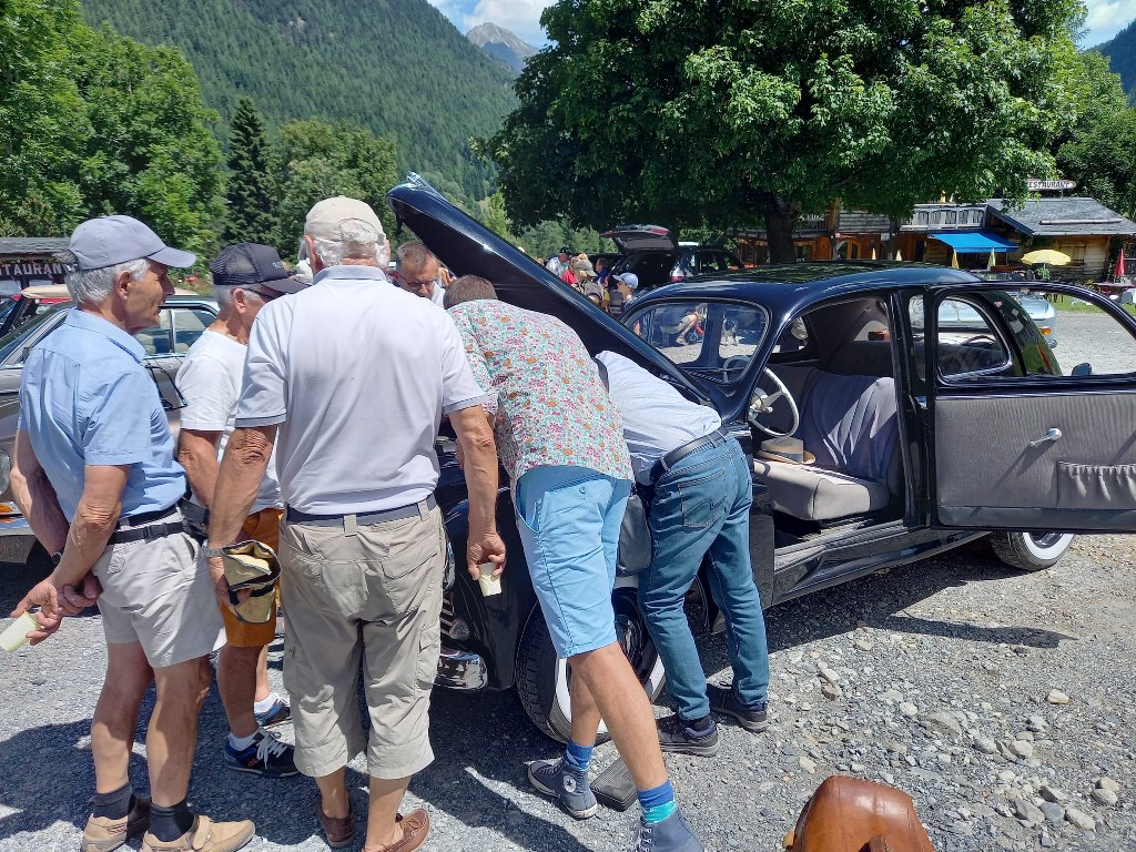 Puis on redescend dans la vallée via Magland et la petite route d'Oex par Luzier, jusqu'au regroupement au lac des Ilettes. 4 ou 5 voitures ont pris un peu de retard, car le cabriolet Caravelle des Frangiamore s'est arrêté inopinément à un rond-point. Le diagnostic est vite posé : c'est la bobine d'allumage qui a soudain pris sa retraite. Heureusement, Vincent est prévoyant et en a une de rechange dans le coffre (avant). Notre président s'attelle au remplacement de la défunte, mais le moteur est encore chaud et la fautive est mal située. Au bout de 20 minutes, on a pu repartir, avec le sourire !