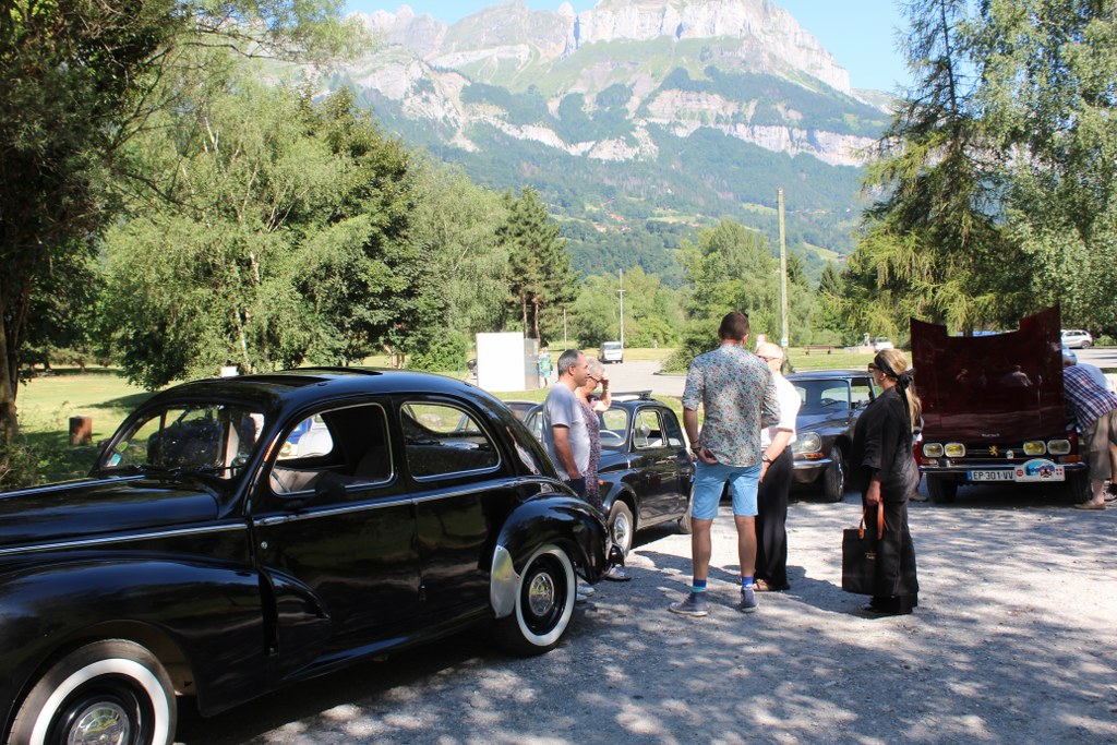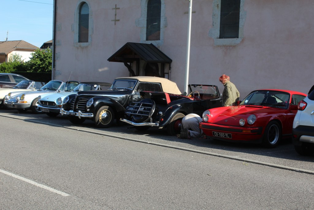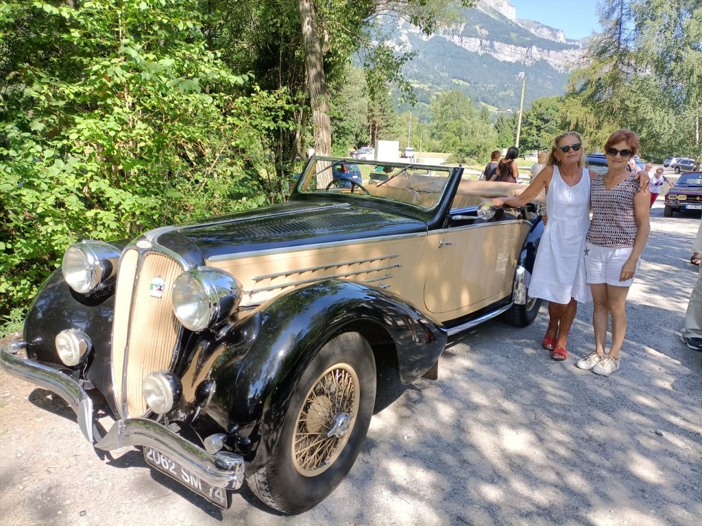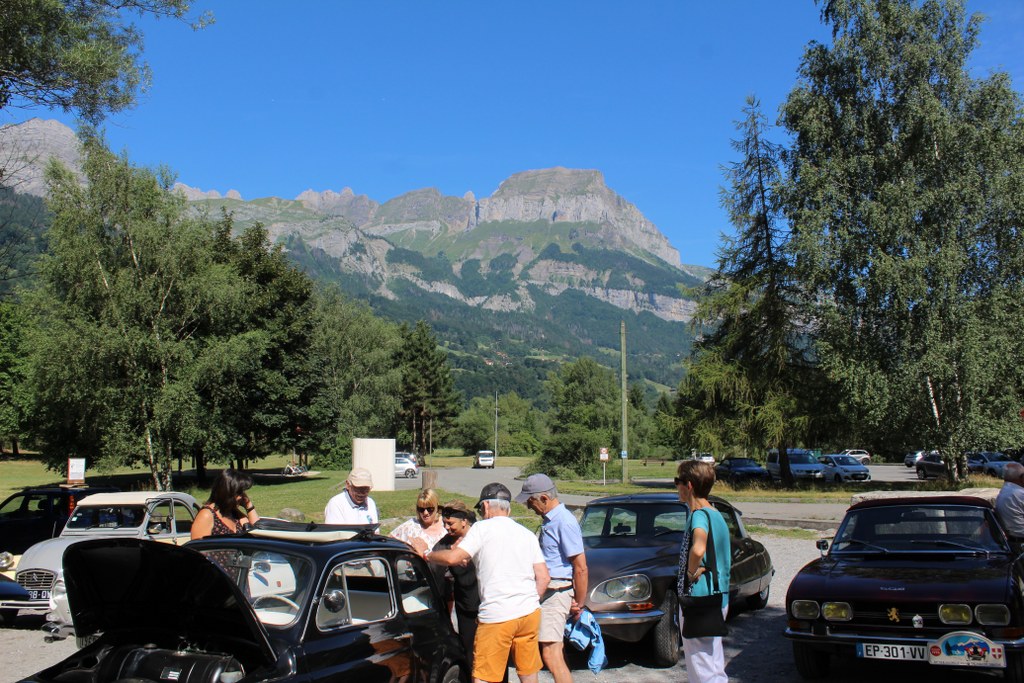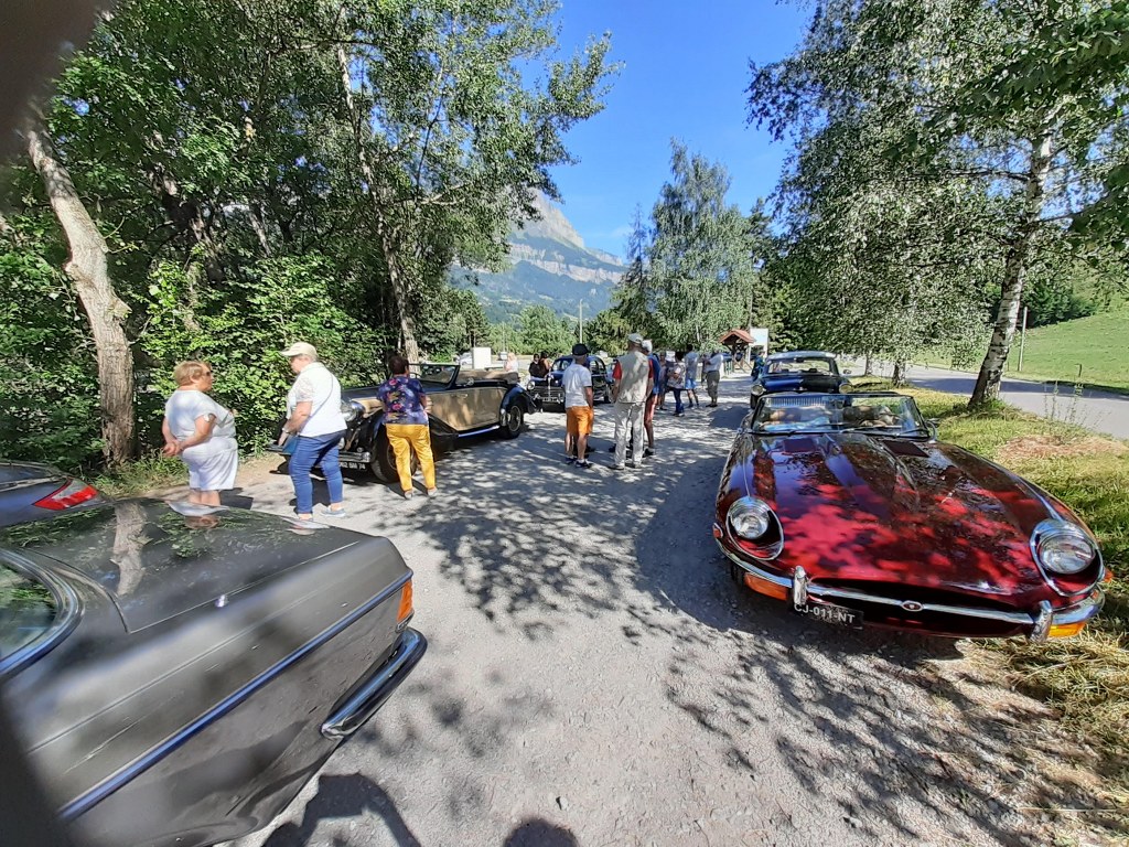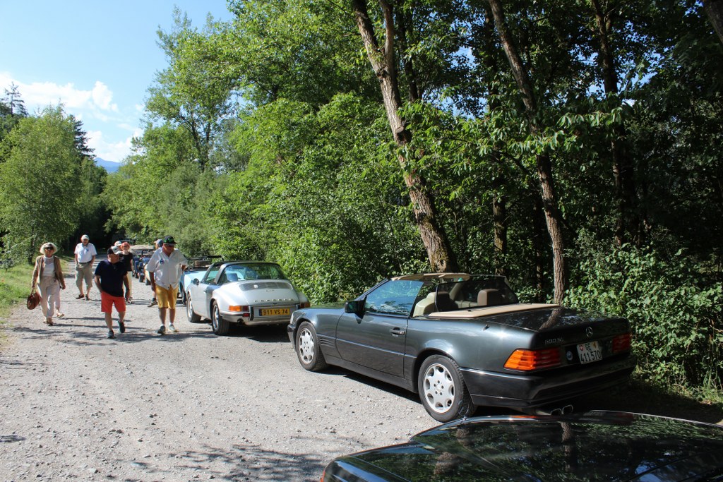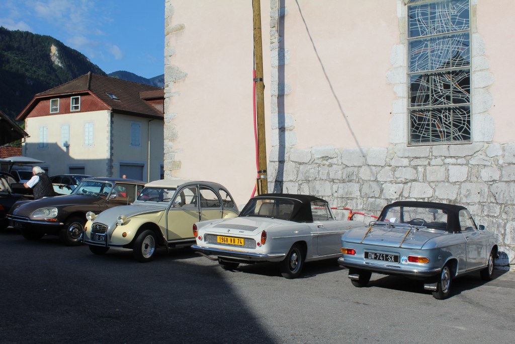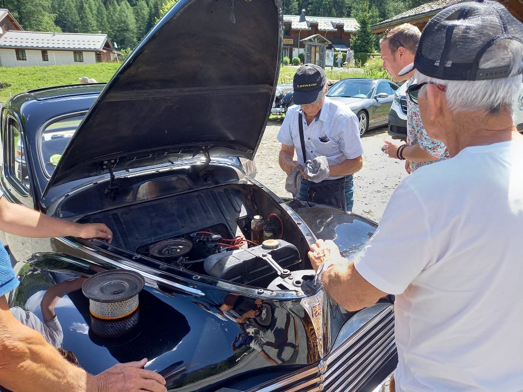 Puis on redescend dans la vallée via Magland et la petite route d'Oex par Luzier, jusqu'au regroupement au lac des Ilettes. 4 ou 5 voitures ont pris un peu de retard, car le cabriolet Caravelle des Frangiamore s'est arrêté inopinément à un rond-point. Le diagnostic est vite posé : c'est la bobine d'allumage qui a soudain pris sa retraite. Heureusement, Vincent est prévoyant et en a une de rechange dans le coffre (avant). Notre président s'attelle au remplacement de la défunte, mais le moteur est encore chaud et la fautive est mal située. Au bout de 20 minutes, on a pu repartir, avec le sourire !