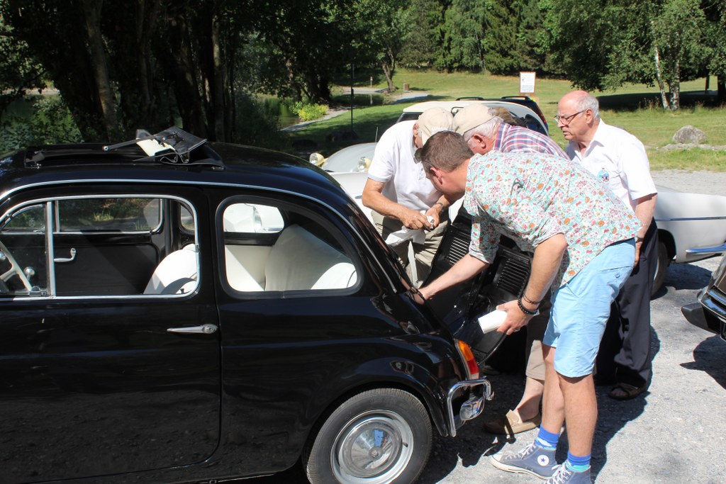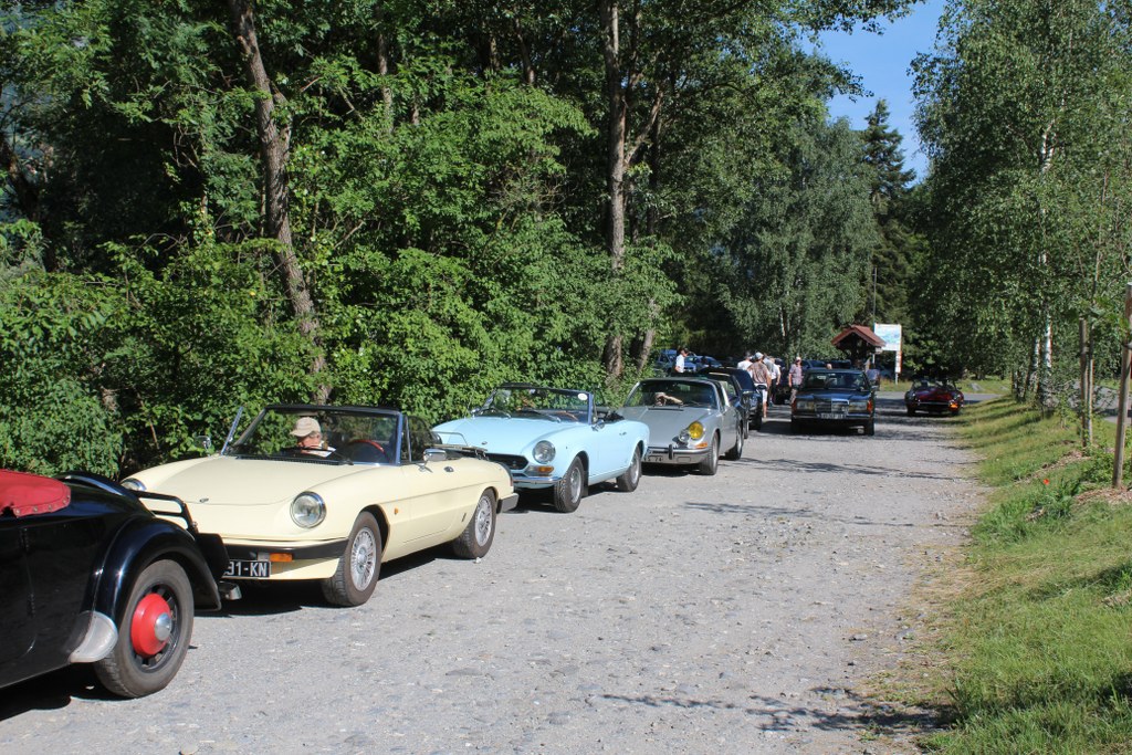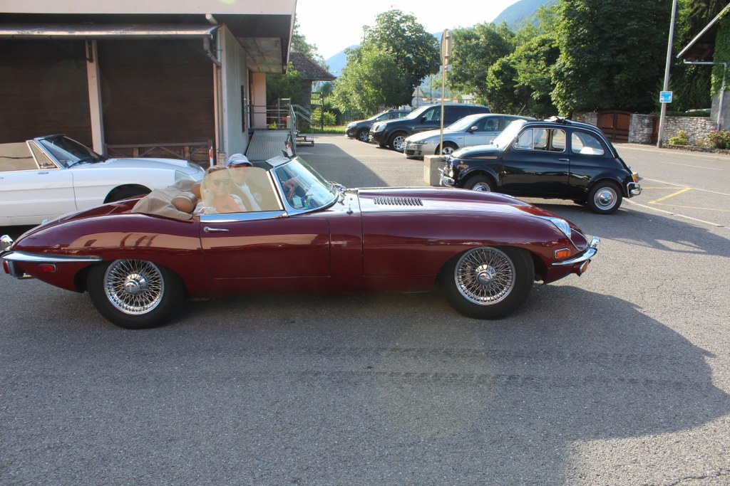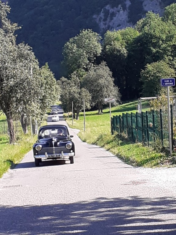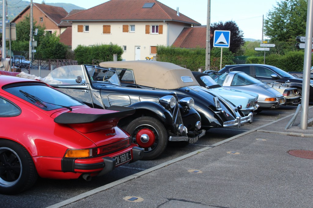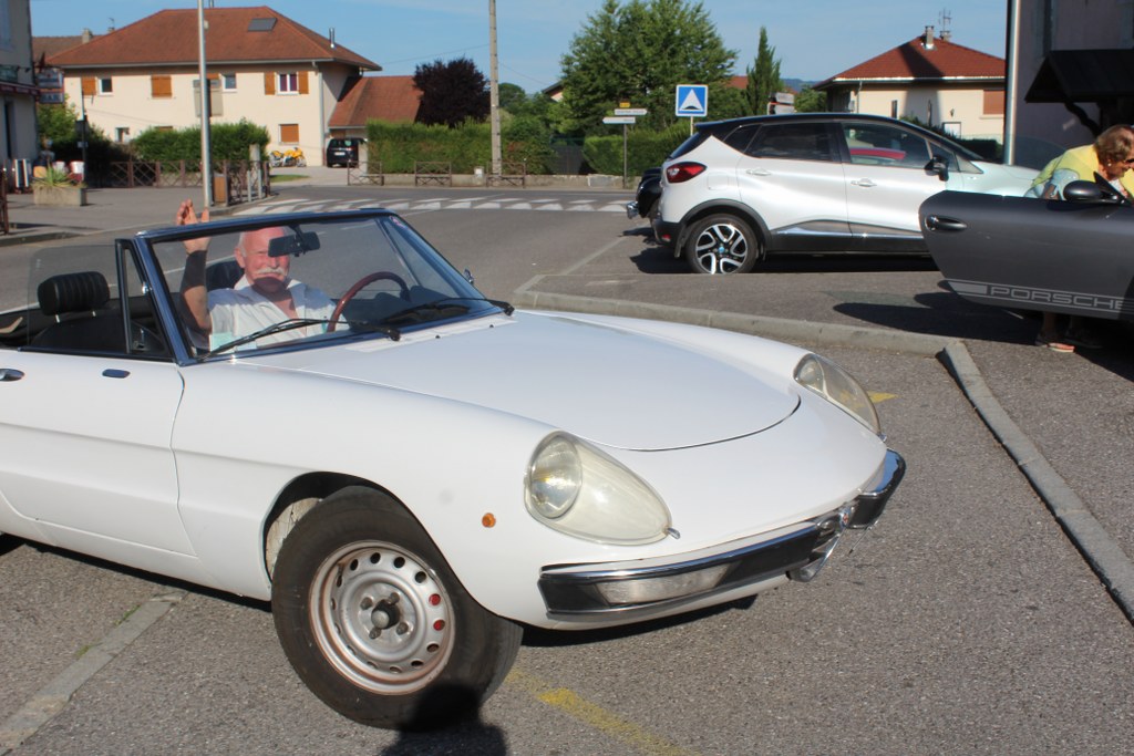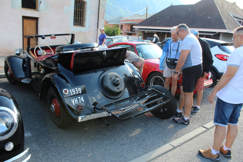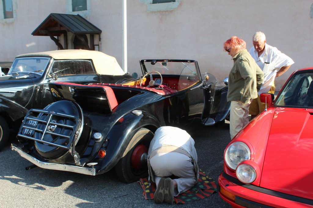 Puis on redescend dans la vallée via Magland et la petite route d'Oex par Luzier, jusqu'au regroupement au lac des Ilettes. 4 ou 5 voitures ont pris un peu de retard, car le cabriolet Caravelle des Frangiamore s'est arrêté inopinément à un rond-point. Le diagnostic est vite posé : c'est la bobine d'allumage qui a soudain pris sa retraite. Heureusement, Vincent est prévoyant et en a une de rechange dans le coffre (avant). Notre président s'attelle au remplacement de la défunte, mais le moteur est encore chaud et la fautive est mal située. Au bout de 20 minutes, on a pu repartir, avec le sourire !