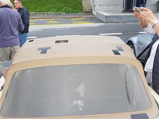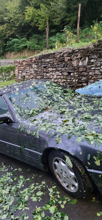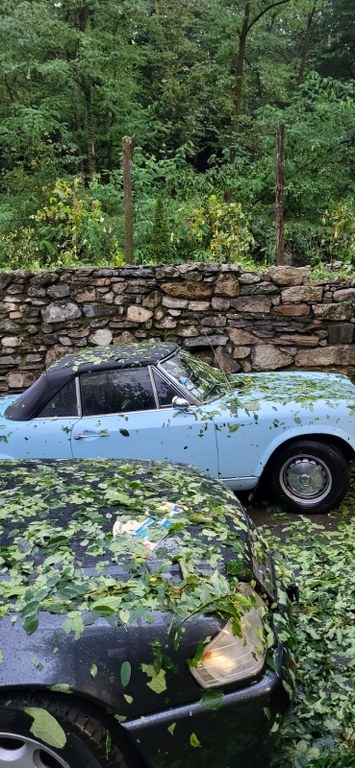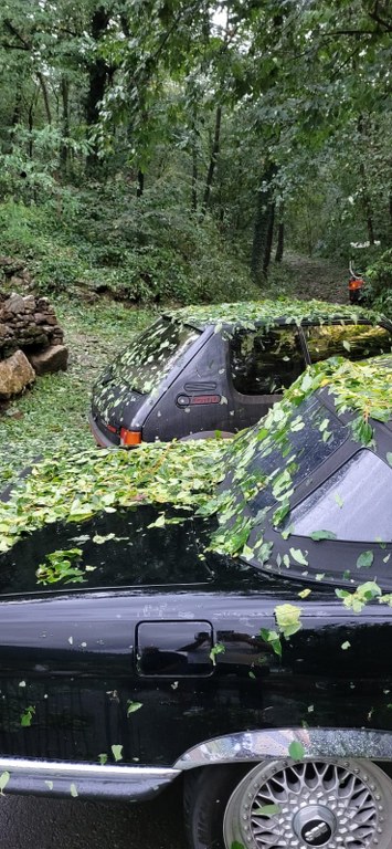 Dans la nuit de samedi à dimanche, pluie de grêle sur nos voitures ! Le matin on évalue les dégats. Les voitures qui étaient sous les arbres ont quand même pris la grêle, mais en plus elles étaient couvertes de feuilles !