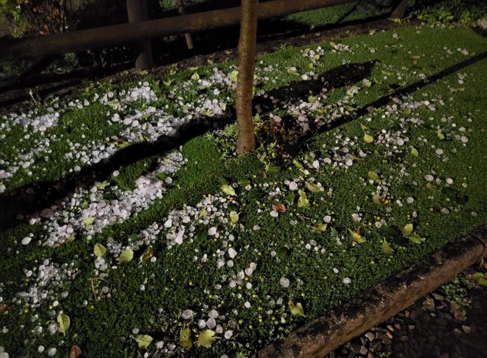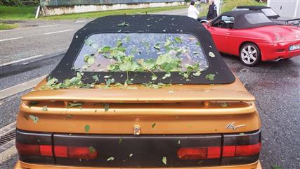 Dans la nuit de samedi à dimanche, pluie de grêle sur nos voitures ! Le matin on évalue les dégats. Les voitures qui étaient sous les arbres ont quand même pris la grêle, mais en plus elles étaient couvertes de feuilles !